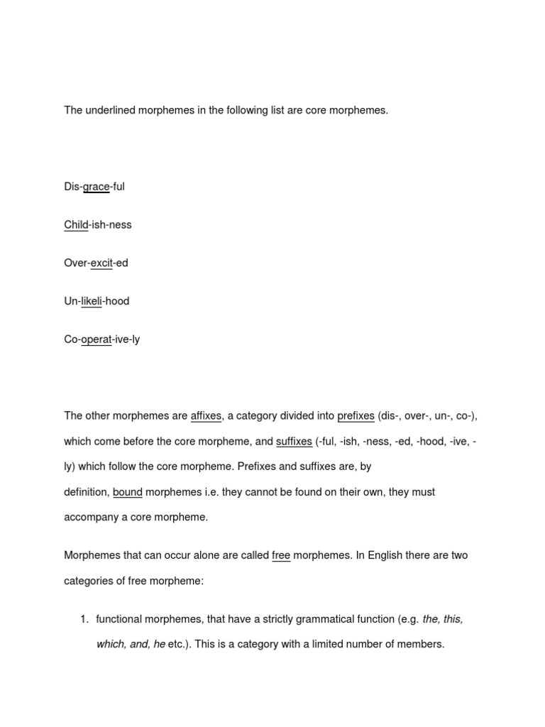 A functional morpheme is a morpheme that can't stand alone in a word or sentence. A morpheme that doesn't have any independent meaning and can be formed with the help of. List the bound morphemes in these words: Two basic types of free morphemes morphemes can be divided into two general classes. Inflectional morphemes are morphemes that indicate grammatical changes. Other types of free morphemes are called functional morphemes. Examples of content words include the english words uncle, manage, huge and rapidly. Examples are and, but, when, because, on, near, above, in, the, that, it, them. Download file pdf master list of morphemes suffi prefi roots suffix master list of morphemes suffi prefi roots suffix when people should go to the book stores, search commencement by shop, shelf by shelf, it is truly problematic. Functional words or grammatical words do not contain meanings on their own. Derivational morphemes are morphemes that change the meaning or word class of a word. And, but, when, because, of, the, between. For instance, in the sentence, it was the best of times;
